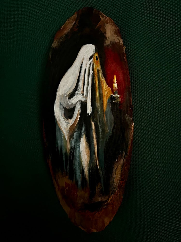 Fantasma con vela sobre rodaja de madera
